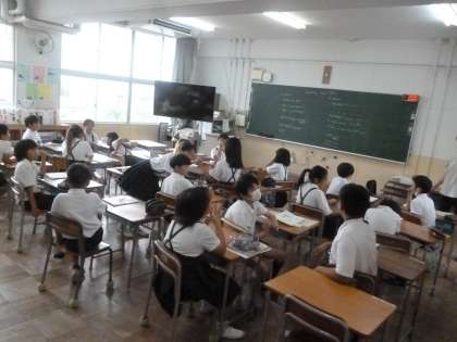 5年2組では英語科でのSpeaking testに向けて、練習をしていました。「What your name?」「Hello,my name is(   ).」、「When is your birthday?」「My birthday is (     ).」などを話します。覚えたら、次は後ろを向いて、見ずに話します。みんな、覚えようとがんばって練習していました。