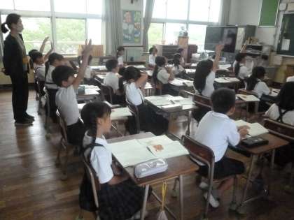 3年生は国語科「ワニのおじいさんのたから物」を学習しています。死んだと思っておにの子が落ち葉をかけていたワニが目を覚ましたところの場面を読み取っていました。時や場所を表す言葉や、「ワニがどれだけ寝ていたのか」を示す言葉に着目して読み取っていました。