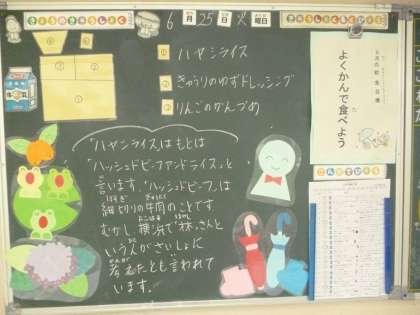 6月25日(火)の給食は、ハヤシライス・牛乳・キャベツのゆずドレッシング・リンゴ(缶詰)です。ハヤシライスは、小麦のアレルギー対応食になっています。