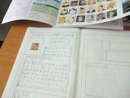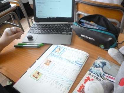 6年1組では社会科の時間にこれまでに習った歴史上の人物についてノートにまとめていました。インターネット調べると、よりたくさんの丈夫を得ることができます。ノートにまとめる時、人物シールを使ったり、タブレットで調べたりした、見やすさにも気を配りながらまとめていました。