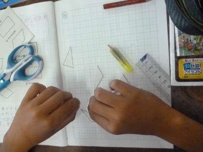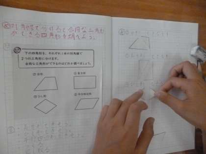 図形の合同と角 公開日 2024/06/27 更新日 2024/06/27 5年 5年2組では算数科「図形の合同と角」を学習しています。台形・ひし形・長方形・平行四辺形、それぞれを対角線で切り、できた2つの三角形が合同かどうか調べます。実際に切り分けて、重ねて調べていました。 いいね(0)