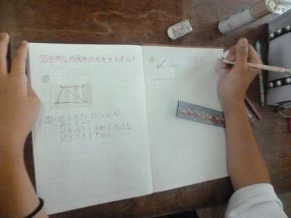 合同な四角形 公開日 2024/07/02 更新日 2024/07/02 5年 5年2組では算数科の時間に、合同な四角形のかき方を考えていました。見通しとしては、四角形を1本の対角線で2つの三角形に分ける方法で解くようです。コンパスや分度器を駆使して、三角形をまず1つ、次にもう1つ、三角形を2つ描いて、四角形が完成したようです。 いいね(0)