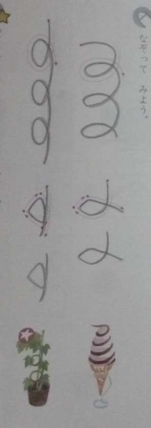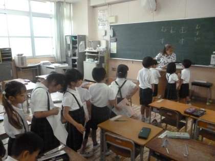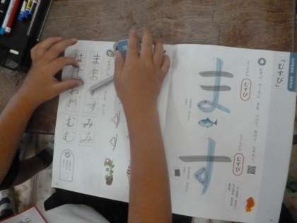 1年生は書写の時間に、ひらがな「ま」や「す」の「むすび」の部分を練習していました。同じ「むすび」でも「ま」は横長、「す」は縦長です。ぐるぐる書きもしながら、練習していました。