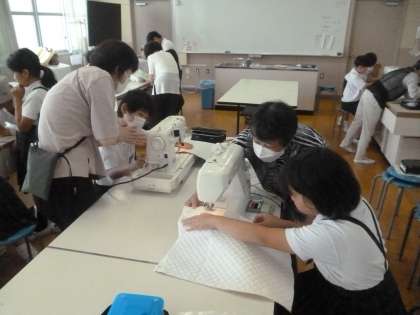 7月3日(水)2・3時限目、今回も生涯学習ルームの方々にゲストティーチャーとしてお越しいただき、5年2組で「ナップサック作り」に取り組みました。5年生は、学校では始めてミシンを扱います。下準備の段階で、待ち針やチャコペンシルの使い方から教えていただきました。ミシンを使う段階になっても、上糸のかけ方や下糸のセットの仕方など、お世話になってばかりでした。