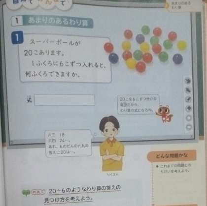 あまりのあるわり算 公開日 2024/07/04 更新日 2024/07/04 3年 3年生は算数科「あまりのあるわり算」を学習しています。20個のビー玉を1袋に6個ずつ入れていき、何袋できるかを答えます。わり算の考え方を使うと、式は「20÷6」になりそうです。でも、6に段では「六一が6、六二12,六三18、六四24、あれ!」どうすればいいでしょうか。 いいね(0)