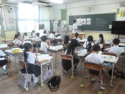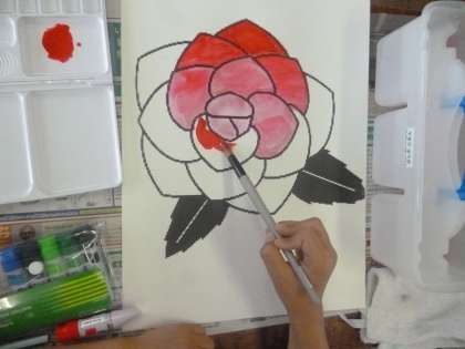 2年2組では図画工作科「花に 色を ていねいに ぬろう」に取り組んでいました。好きな花を選んで、花びらに好きな色を塗っていきます。一色しか使わないのですが、加える水の量を変えて、濃さが変わっていくように塗っていきます。最初は恐る恐る塗っていましたが、慣れてきたら大胆に水の量を変えて塗っていました。