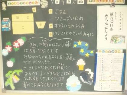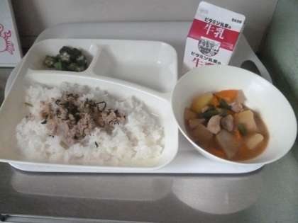 7月9日(火)の給食は、ご飯・牛乳・鶏肉と野菜の味噌煮・オクラの梅風味・ツナっ葉炒めです。