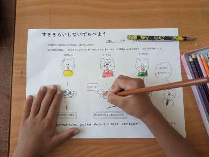 コロちゃんはパンが苦手、トトちゃんは肉が苦手、プーちゃんは野菜が苦手です。子ぐまたちは、お母さんぐまが作った夕飯を残していると、お父さんぐまから「好き嫌いをしていると、体が成長しないし、力もでない、病気にかかりやすくなるんだよ」と言われ、3匹はそれから好き嫌いなくなんでも食べるようになります。子どもたちにも好き嫌いなく食べることが体に良いことを伝えました。それから食べ物を働きの色のグループに分けて、ワークシートにもきれいに色ぬりをしました。