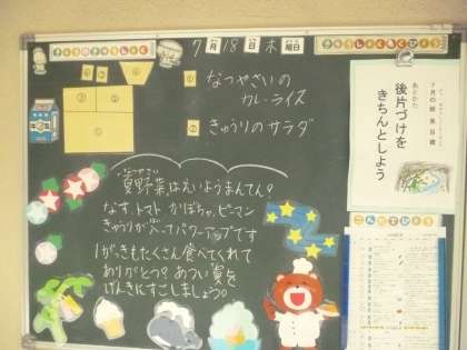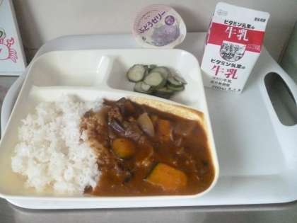 7月18日(木)の給食は、夏野菜のカレーライス・牛乳・きゅうりのサラダ・みかんゼリーです。