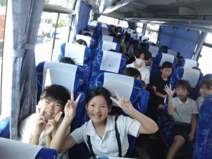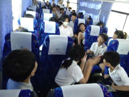 バス内で「林間学習で楽しみにしていること」を発表しています。魚つかみやキャンプファイヤー、カレー作りが多いみたいです。登山が楽しみな人はほとんどいないです。