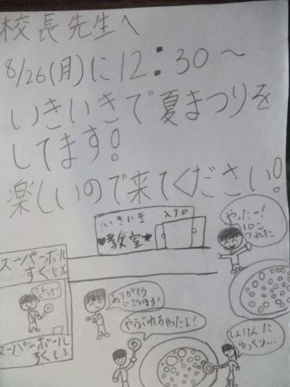 いきいき夏まつり1 公開日 2024/08/26 更新日 2024/08/26 その他 夏休み最後の8月27日(月)、いきいき活動では夏祭りが開かれました。 「わなげ」「まといれ」の様子です。 いいね(0)