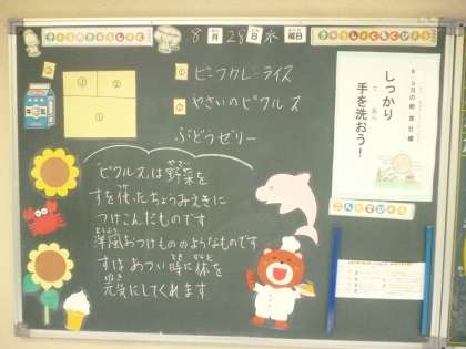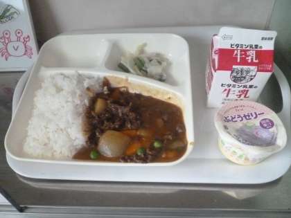 8月28日(水)の給食は、ビーフカレーライス・牛乳・野菜のピクルス・ぶどうゼリーです。