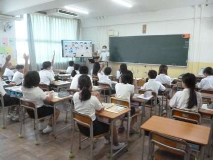He can run fast. She can do kendama. 公開日 2024/08/28 更新日 2024/08/28 5年 5年2組では英語科「He can run fast. She can do kendama.」を学習していました。グラウンドで子どもたちが活動している様子を見て、「He can play baseball.」「What do she do?」など、英語で会話をしています。映像からの問いかけをヒアリングしていました。しっかり聴き取って受け答えしていました。 いいね(0)