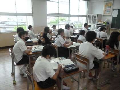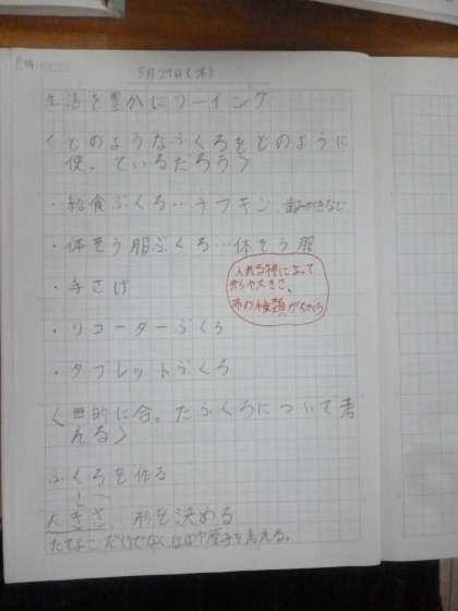 6年1組では家庭科「生活を豊かにソーイング」を学習していました。自分たちは、生活の中で、どのような袋をどのように使っているのか話し合っていました。給食・体操服・リコーダー……、袋に入れる物は数え切れません。