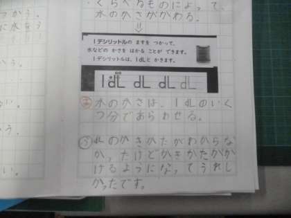 ふりかえり 公開日 2024/08/30 更新日 2024/08/30 2年 2年1組では算数科「水のかさ」を学習しています。前時に、水のかさを測るのに「dl」という単位があることを習いました。「dl」を書く練習では、慣れないアルファベットを慎重になぞっていました。 次は、前日の授業の「ふりかえり」を書きました。学習して、「わかったこと」や「できるようになったこと」、「考えたこと」「次に学んでみたいこと」などをノートに綴っていました。 いいね(0)