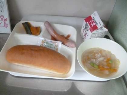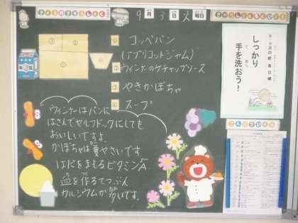 9月3日(火)の給食は、コッペパン・アプリコットジャム・牛乳・ウインナーのケチャップソース・スープ・焼カボチャです。