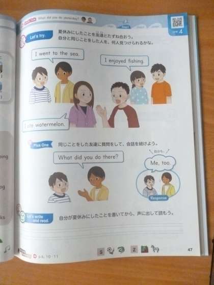 夏休みにしたことをたずね合おう 公開日 2024/09/03 更新日 2024/09/03 6年 6年2組では「夏休みにしたことをたずね合おう」に取り組んでいました。夏休みにしたことを「I went to ( ).」「I enjoyed ( ).」のように表していきます。「What did you do there?」のように質問したり、「Me,too.」のように同調したりして、お友だちと会話を続けていきました。 いいね(0)