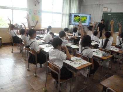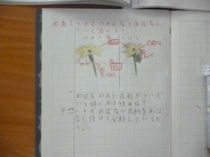 それでは先生から質問です。「めばなの先に花粉がついていることがあります。どうしてでしょうか。」みんな自分なりに考えて予想をノートに書いていました。