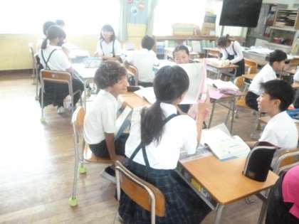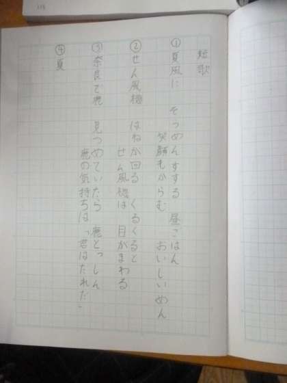 5年1組では国語科の時間に、夏にちなんだ短歌を考えていました。考えた短歌をノートに書いて、グループで発表しあっていました。季語は「夏休み」が多かったようで、夏休みに心に残ったことが多かったのだと思われます。短い時間内でいくつも短歌をつくれているので感心しました。