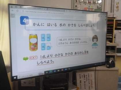 1dlより小さなかさ 公開日 2024/09/03 更新日 2024/09/03 2年 2年1組では算数科の時間、缶に入る水のかさを調べました。1dlマスで量ると3杯と少し残りました。この残った水のかさを量るにはどうすればいいのでしょうか。 1dlよりちいさいかさの単位があればよさそうだと気づきました。dlより小さなかさの単位、どこかで聞いたことがないでしょうか。 いいね(0)
