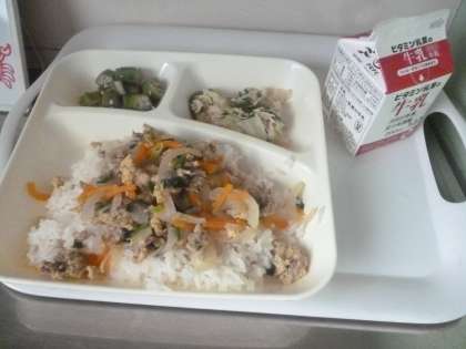 9月4日(水)の給食は、他人丼・牛乳・ささみと野菜の炒め物・オクラの甘酢あえです。他人丼は、卵の除去食対応献立です。