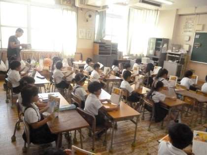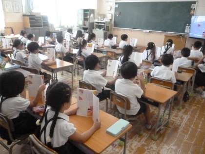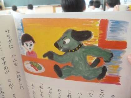 1年生は国語科「サラダで げんき」の学習が始まりました。先生が物語を読んだ後、みんなが続いて音読します。正しい姿勢で音読するように気をつけていました。
