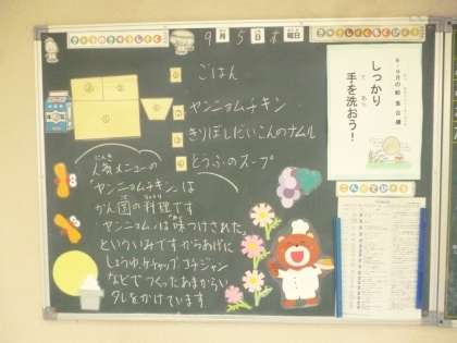 9月5日(木)の給食は、ご飯・牛乳・ヤンニョムチキン・豆腐のスープ・切り干しだいこんのナムルです。