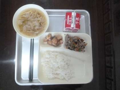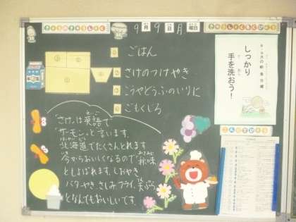 9月9日(月)の給食は、ご飯・牛乳・さけのつけ焼き・五目汁・高野豆腐の炒り煮です。