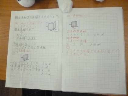 6年1組では算数科の時間に、三角柱の体積の求め方を考えていました。前時に四角柱の体積の求め方は「底面積×高さ」であることがわかりました。三角柱でも同様の考え方で求めることができないか、また、違う求め方はないのかを話し合いました。