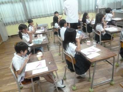そして、前歯に染め出し液をつけて、はみがきの練習をしました。歯ブラシを横にして磨くだけでは、歯と歯茎の間や歯と歯の間がうまく磨けないようです。歯ブラシを縦にしたり、歯ブラシを軽く鉛筆もちにしたりして、前歯の隅々まで磨くことができたようです。