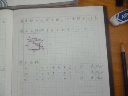 角柱の体積 公開日 2024/09/12 更新日 2024/09/12 6年 5年2組では算数科の時間に、前時までに導き出した「角柱の体積を求める公式」を使って、複雑な形をした角柱の体積を求めていました。子どもたちからは、何通りかの求め方が発表されました。「5年生の時に、似たような問題を習った。」をいう声も聞かれました。以前学習したことを応用して考えられるのは素晴らしいことです。 いいね(0)