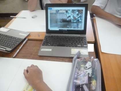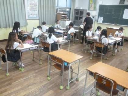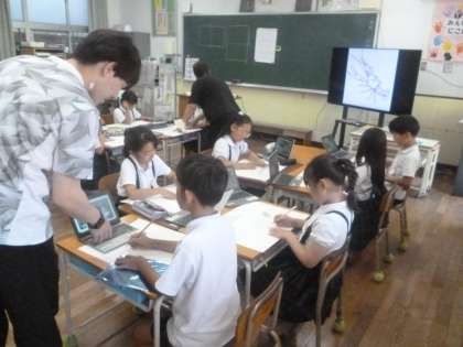 2年2組では図画工作科の時間に、ザリガニの絵を描くことに取り組んでいました。生活科の時間にタブレットで撮ったザリガニの写真を見ながら描き進めていきます。