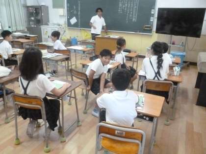 4年1組では道徳科「ぼくの草取り体験」を学習しています。学習の最初に、自分たちが人のためにしたことを発表しあいました。家で家族のためにしたこと、学校でお友だちのためにしたことなど、いくつも出されました。