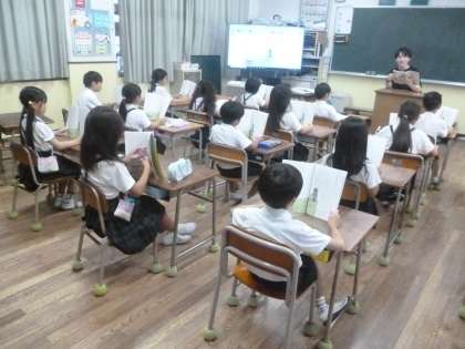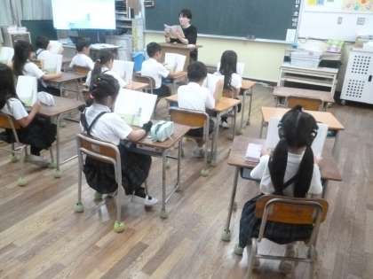 最初は先生が読んでいきます。みんなは聞きながら物語の面白さあを感じてほしいです。