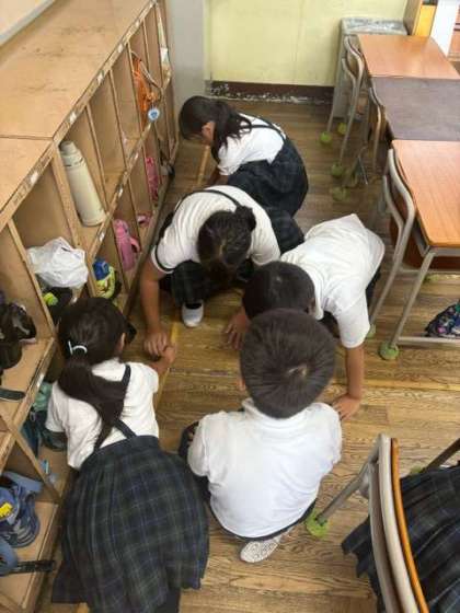 長い長さの勉強中です。教室の長さは何メートルかな?ものさしをつないで測りました。うわー!めっちゃ長い!!キラキラした顔がいっぱいの1時間でした。