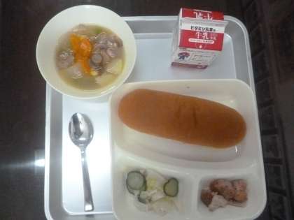9月20日(金)の給食は、黒糖パン・牛乳・鶏肉のバジル焼き・ベーコンと野菜のスープ煮・キャベツときゅうりのサラダです。