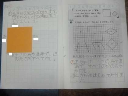 正方形 公開日 2024/09/20 更新日 2024/09/20 2年 2年1組では算数科の時間に「正方形」について学習したいました。前時に習った長方形から、さらに4つの辺も同じ長さになるように切りました。4つすべての角が直角で、全ての辺が等しい長さの四角形「正方形」、ノートにまとめていました。 いいね(0)
