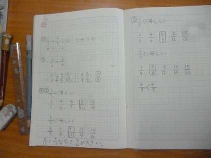 分母を同じにするか、分子を同じにするか 公開日 2024/09/24 更新日 2024/09/24 5年 5年1組では算数科の時間に、2/3と3/4の大きさを比べていました。見通しでは、分母を同じにする方法と分子を同じにする方法が出ました。分母を同じにすると8/12と9/12、分子を同じにすると6/9と6/8、どちらの方法が大きさを比べやすいのかを話し合っていました。 いいね(0)