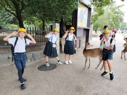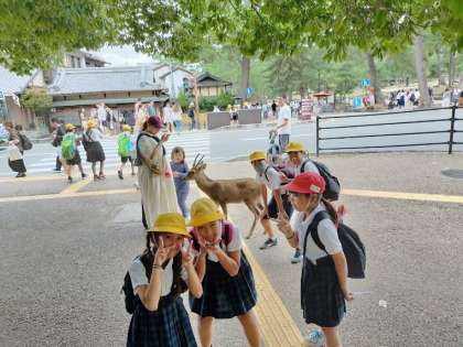9月27日(金)5年生が奈良公園へ遠足に行きました。奈良駅を降りると、早速シカがお迎えに来てくれました。