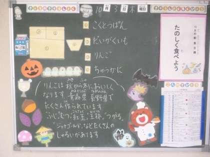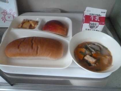 10月3日(木)の給食は、黒糖パン・牛乳・中華煮・大学いも・りんごです。