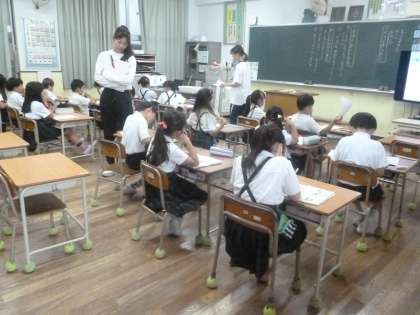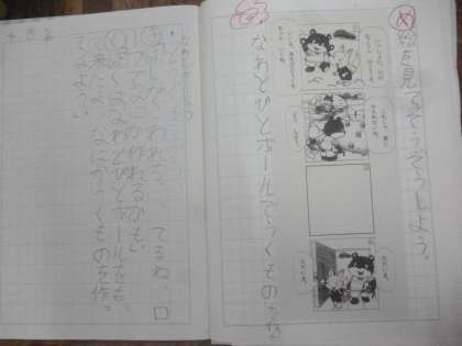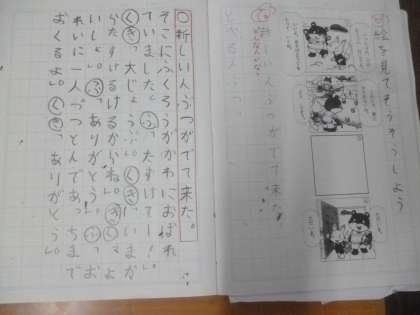 2年2組では国語科「絵を 見て そうぞうしよう」を学習していました。前時に、4コマ漫画の3コマ目を考えました。本時では、その内容をより詳しく書き直しました。たとえば、「道具を使う。」なら、「リュックの中になわとびが入っています。そのなわとびを使って……。」のように。また「新しい人がやってくる。」では、「おじちゃんを見つけました。『おじちゃん、橋を通してくれませんか。』」のように、工夫して書き加えていました。