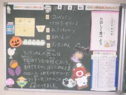 10月8日(火)の給食は、コッペパン・ソフトマーガリン・牛乳・タンタンメン・あっさりキャベツ・豆こんぶです。