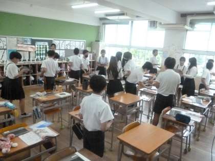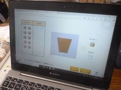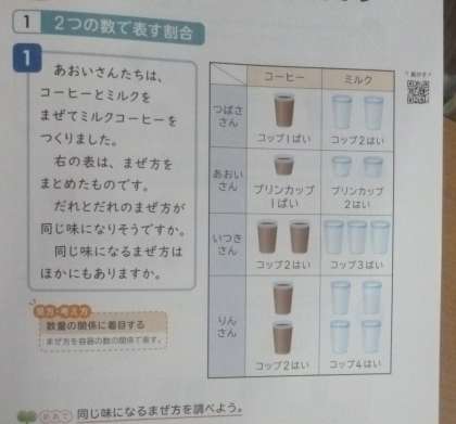 同じ割合になる友だちを探そう 公開日 2024/10/08 更新日 2024/10/08 6年 6年1組では算数科「比」を学習しています。次のような問題、同じ割合になるミルクコーヒーを探す問題をしました。次は、問題横のQRコードを読んでみると、タブレット画面に自分の考えた割合でミルクコーヒーを作る問題が映りました。 では、自分が考えた割合のミルクコーヒーと同じ割合のお友だちを見つけます。では、スタート。 いいね(0)