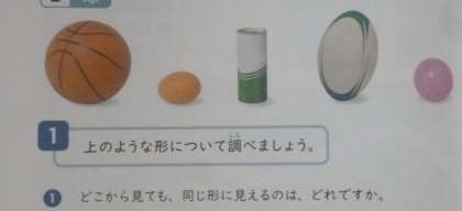 球 公開日 2024/10/08 更新日 2024/10/08 3年 3年生は算数科の時間に、次のような問題に取り組んでいました。どこから見ても同じ形に見えるのはどれでしょう。卵やバドミントン羽を入れる缶・ラグビーボールは、見る方向によって円や楕円形・長方形に見えるようです。 どこから見ても円に見える形を「球」ということがわかりました。では、球の特徴をさらに調べます。 いいね(0)