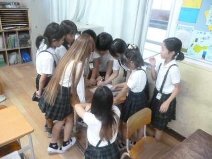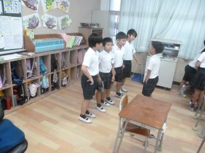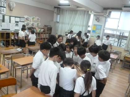 4年生では運動会の団体競技で「台風の目」をします。1・2組合同で、走る順番や4人組の並び方を話し合っていました。棒を4人で持って走りますが、最も内側の児童は回転するとき棒を回さなければいけません。最も外側の児童はいちばん速く走らなければいけません。綿密な打ち合わせをしていました。
