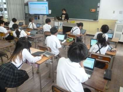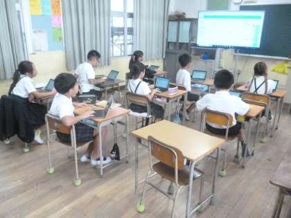 4年2組では国語科「くらしの中の和と洋」を学習しています。本時では、和風と洋風の物を衣食住に分類して、タブレットにまとめていました。タブレットの機能を使って調べてみるのもOKのようです。キーボードに文字を打ち込むのはかなり慣れてきました。衣では和服と洋服、住では畳とジュータンなど、次々と入力していきました。