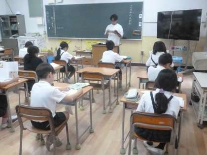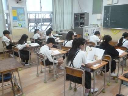 4年1組では道徳科「さち子のえがお」に取り組んでいました。文房具売り場で会った友だちのユミから万引きすることを誘われました。心が揺れているさち子の気もちについて話し合い、じぶんならどうすべきか考えました。「はっきり断ってとかった。」「ユミにも、こんなことはやめてほしい。」などの感想が出ていました。