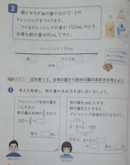 全体の量から部分の量を求める 公開日 2024/10/15 更新日 2024/10/15 6年 6年1組では算数科の時間に、次のような問題に取り組んでいました。ドレッシング(全体)の量から、酢の量を計算します。図を使って計算したり、5年生で習った割合の考え方を使ったりいろいろな解き方があります。今回は、新たに習った比を使って解く方法も考えていました。 いいね(0)