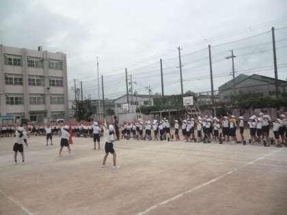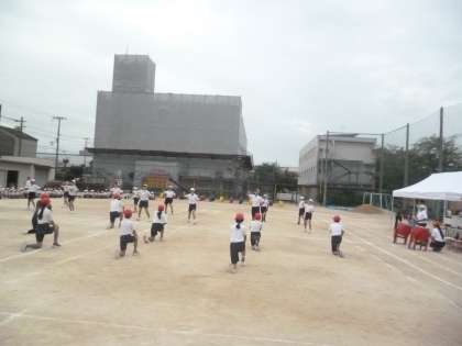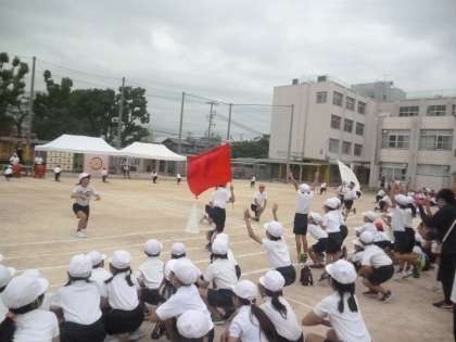 最後に応援団の練習をしました。応援団長の声に合わせて、みんなも声を出したり拍手をしたり体を動かしたりします。エールの交換・三三七拍子・ウェーブ・応援歌ゴーゴーゴーの応酬、元気いっぱい応援合戦でした。