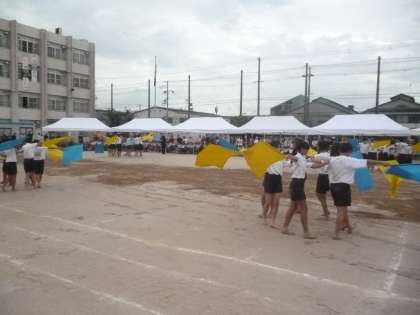 この時点で激しい雨が降ってきたので、一時中断しました。ご参会いただきました方々には、中断の間お待ちいただいてありがとう存じました。雨が止み、団体演技「Flag〜心をひとつに」(6年)で再開しました。